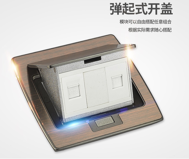 铜合金弹起式插座,需要它时弹起来,不需要它时合起来。让宽广的场所,不需要电源线延长就可以用电;让玻璃墙面的周围也可以方便的用电;连接地灯或者家庭影院;多种时尚和紧凑的面板,点缀您的地面/桌面;集通用、实用和装饰于一体的开放式布线功能。